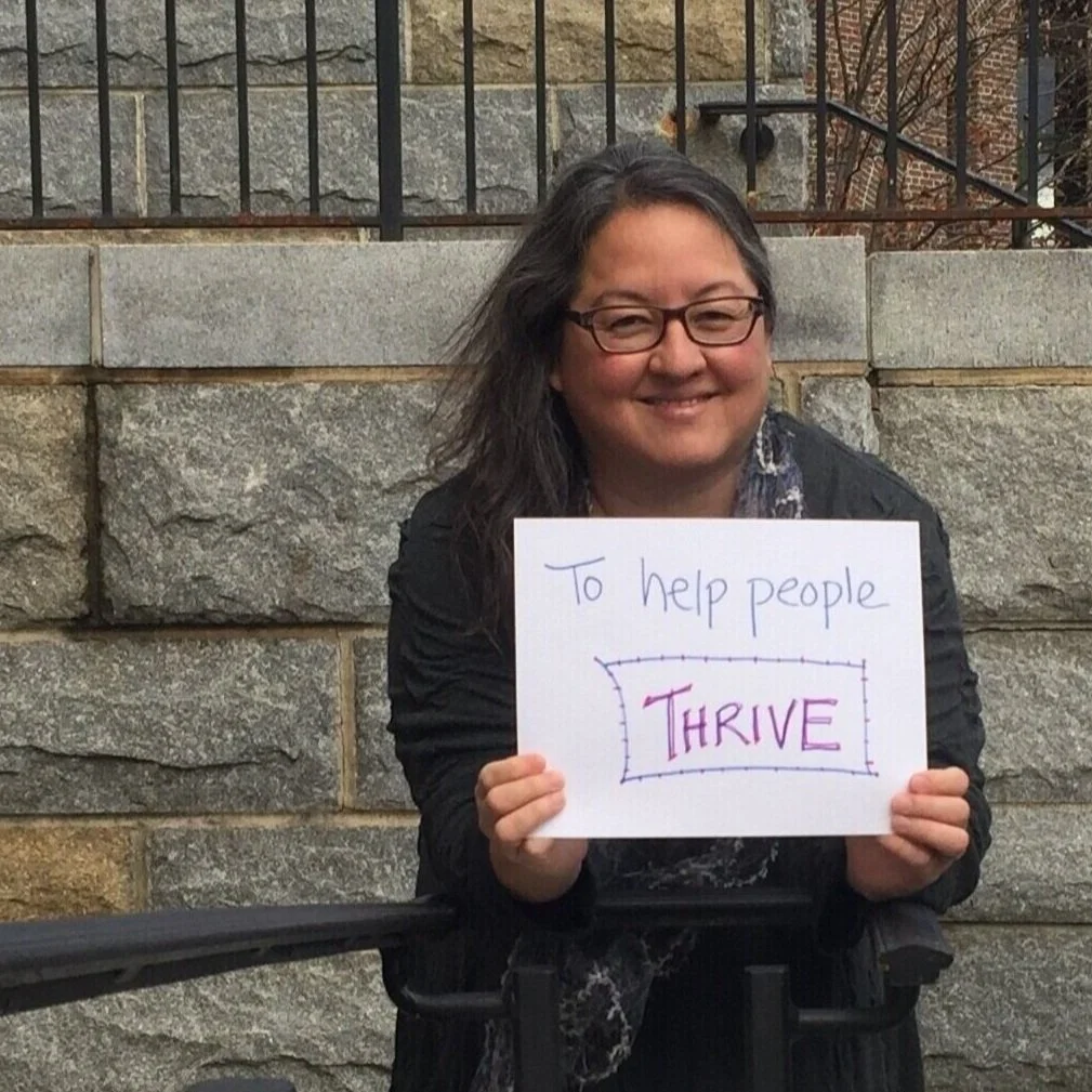 In this image, Anna is holding up a handmade sign that says, “To help people THRIVE.” She is standing outside and wearing glasses.
